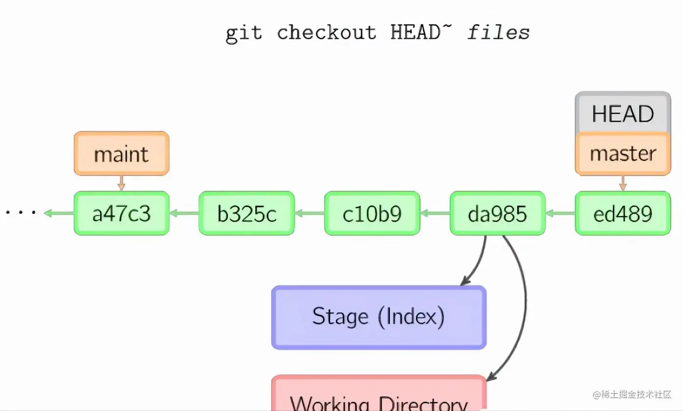 checkout命令用于从历史提交(或者暂存区域)中拷贝文件到工作目录,也可用于切换分支。当给定某个文件名(或者打开-p选项,或者文件名和-p选项同时打开)时,git会从指定的提交中拷贝文件到暂存区域和工作目录。比如,git checkout HEAD~ foo.c会将提交节点HEAD~(即当前提交节点的父节点)中的foo.c复制到工作目录并且加到暂存区域中。(如果命令中没有指定提交节点,则会从暂存区域中拷贝内容。)注意当前分支不会发生变化。