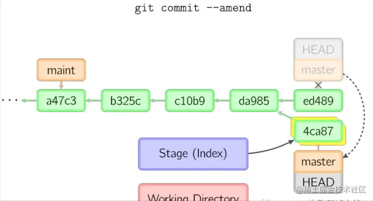 如果想更改一次提交,使用 git commit --amend。git会使用与当前提交相同的父节点进行一次新提交,旧的提交会被取消。