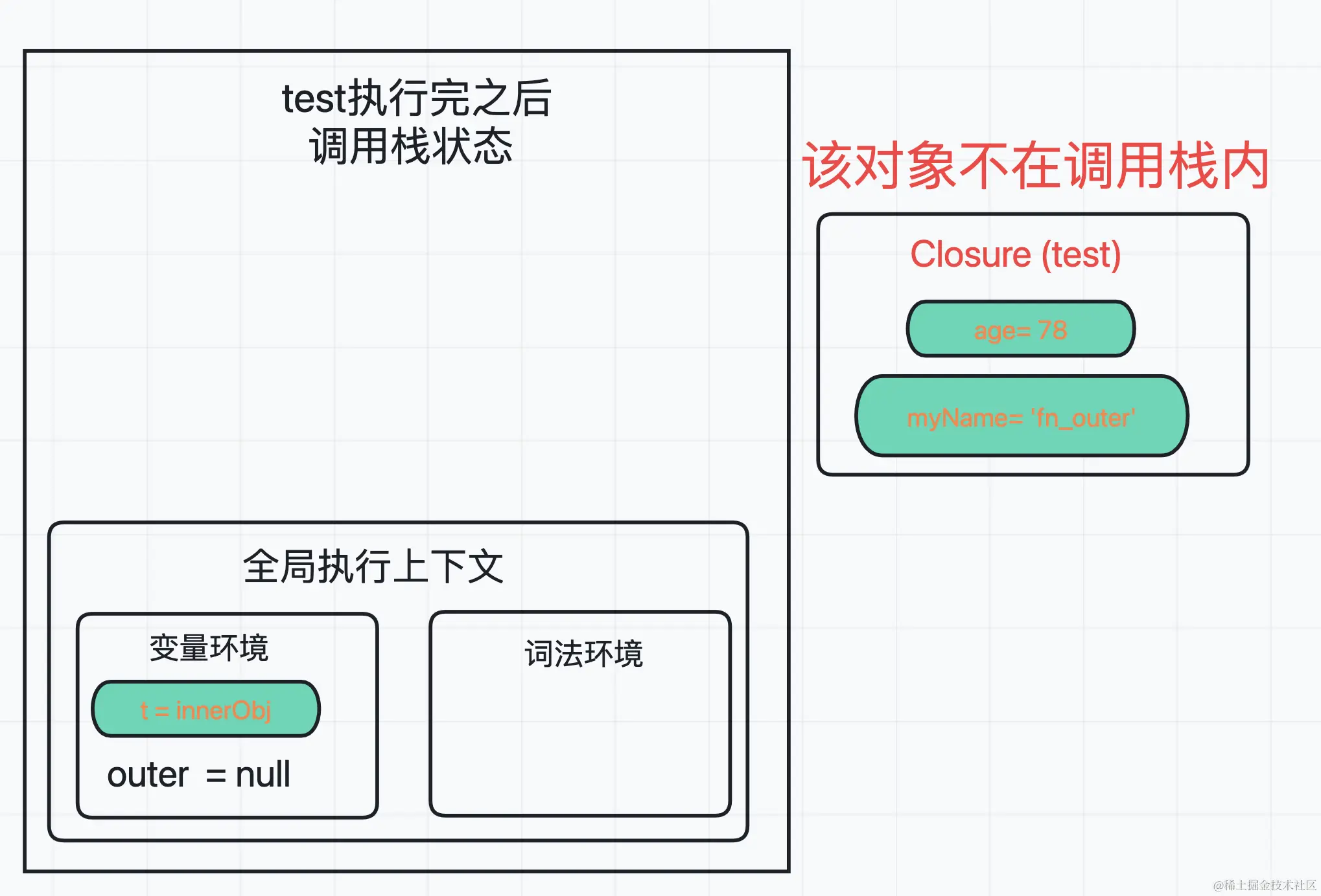 test 函数执行完成之后,其执行上下文从栈顶弹出了 但是由于返回的 setName 和 getName 方法中使用了 test 函数内部的变量 myName 和 age 所以这两个变量依然保存在内存中(Closure (test))