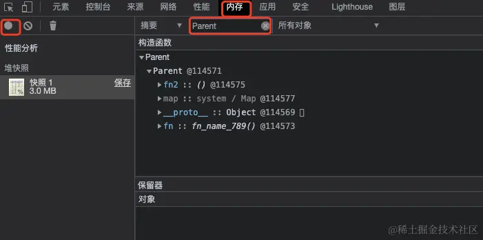 将开发者工具切换到 Memory 标签,然后点击左侧的小圆圈就可以捕获当前的内存快照