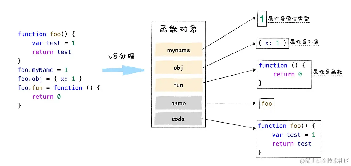 在 V8 内部,会为函数对象添加了两个隐藏属性