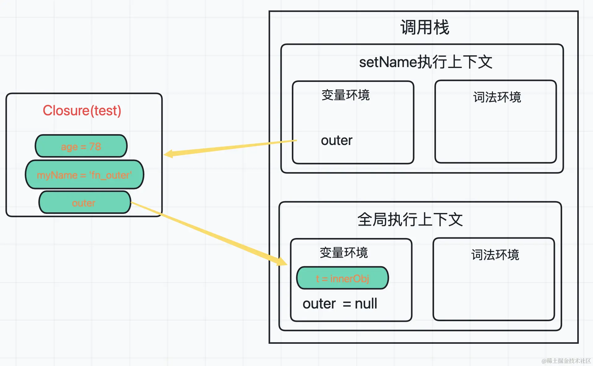 当 V8 执行到 test 函数时,首先会编译,并创建一个空执行上下文。在编译过程中,遇到内部函数 setName, V8还要对内部函数做一次快速的词法扫描(预扫描) 发现该内部函数引用了 test 函数中的 myName 变量。 由于是内部函数引用了外部函数的变量,所以 V8 判断这是一个闭包。于是在堆空间创建换一个closure(test)的对象 (这是一个内部对象,JavaScript 是无法访问的),用来保存 myName 变量。
