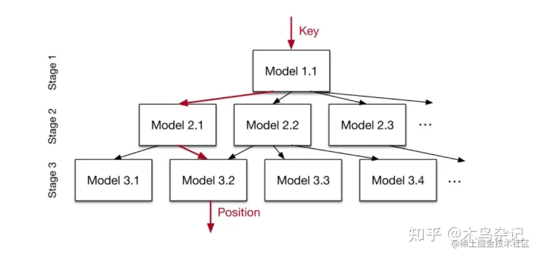 - B-Tree 利用模型对 Key 进行具体存储位置的预测,但是单模型的预测范围的误差很大,采用层级模式训练的多 stage 的模型改良预测结果,最后一个 stage 的模型会输出 Key 具体的位置,从而使得每个最终 stage 模型只需要学习数据的一个子集,降低了预测误差范围。在实验中多个数据集下学习索引在存储利用率和速度上都优于B树索引。但是更复杂的模型依赖于GPU/TPU等硬件的提升,在CPU场景下无法体现出搜索的优势。