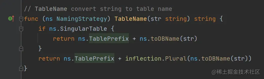 通过查询文档发现,在gorm.Config{}里面有一个配置叫NamingStrategy,感觉应该和这个配置有关系,通过对这个参数if的判断找到用它的地方,有一个TableName方法引起了我的注意