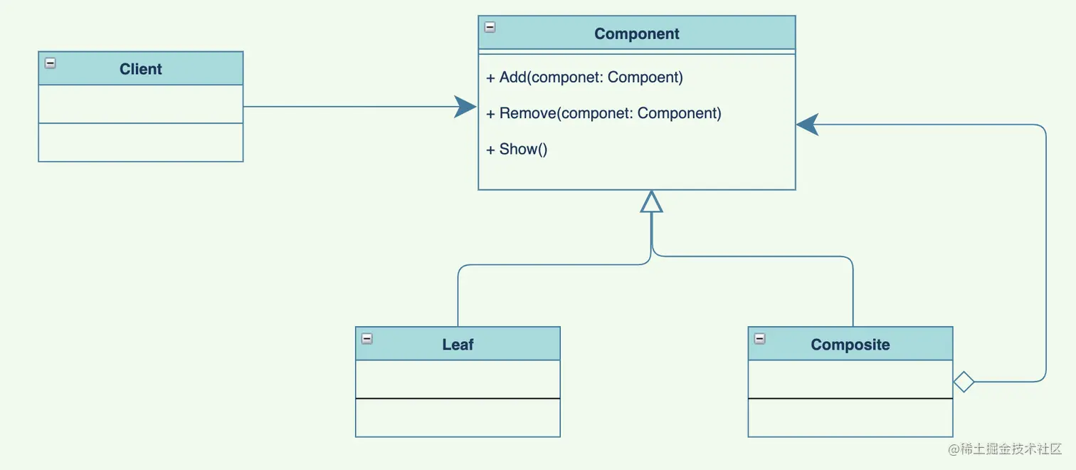 Component):一般是接口或者抽象类,是叶子构件和容器构件对象声明接口,抽象出访问以及管理子构件的方法。 - 叶子节点(