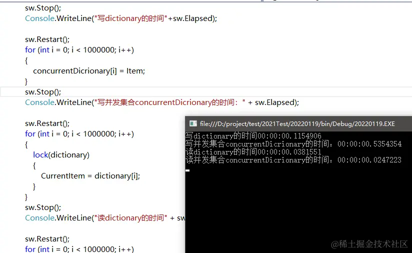 Console.WriteLine("读并发集合concurrentDicrionary的时间:" + sw.Elapsed);