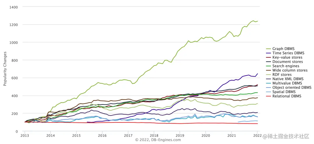 图数据库一直是业界的热门话题。它具有用于语义查询的图形结构,使用顶点、边和属性来表示和存储数据,支持对在关系数据库系统中难以建模的复杂层次结构进行简单快速的检索,优雅地解决了传统关系数据库在针对复杂关系或多表 JOIN 情况运行结果时经常出现的性能或故障问题。我们身边有很多图应用的案例,比如 Google PageRank 算法;LinkedIn 用图管理社交关系,实现好友推荐;Amazon 用图实现实时的商品推荐;银行用图做风控,实现反欺诈和反洗钱等等。从 DB Engine 的统计数据可以看到,在全球范围内,从 2014 年开始,图数据库的受欢迎程度一直呈现迅猛的上升态势,超越了其他各种类型的数据库。据 Gartner 预测,到 2025 年图技术在数据和分析创新中的占比将从 2021 年的 10% 上升到 80%,该技术将促进整个企业机构的快速决策。