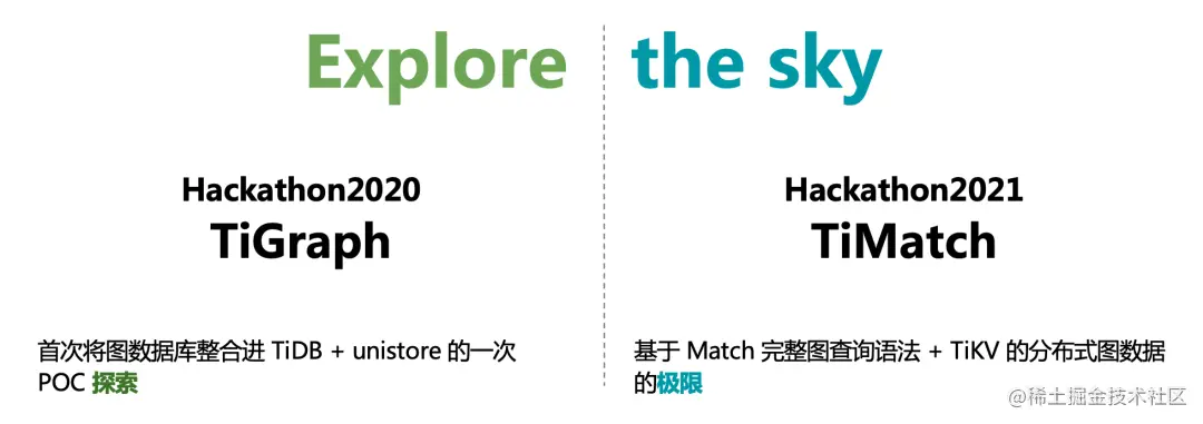 去年的 TiGraph 项目留下了一些遗憾,比如图查询语言不完备,没有接入 TiKV 存储引擎等。这次 Hackathon 赛事中 TiMatch 的任务就是基于 TiDB 和 TiKV 设计语法完备的分布式图数据库雏形,继续探索在 TiDB 之上构建一个成熟且易于使用的图数据库的路径,TiMatch 实现了三大方面的提升。
