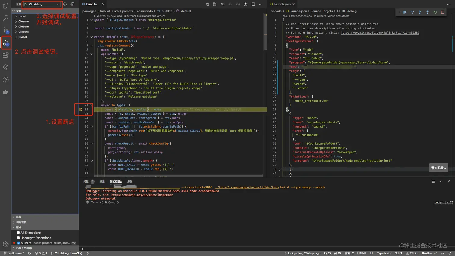 例如调试 @tarojs/mini-runner,先进入 packages/mini-runner/,然后在此目录下对运行 npm run dev(各子包编译命令可能有所不同,详情请见各子包的 package.json)。这样我们就能对每次修改后的代码进行调试。