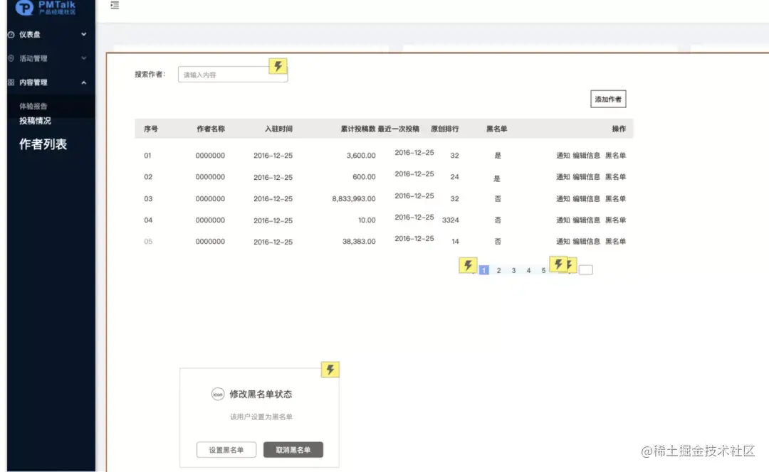 有了数据看板后,接下来针对作者明细查看设计作者列表页面,对于违规作者可以进行权限限制,避免影响其他用户和社区DAU数据。