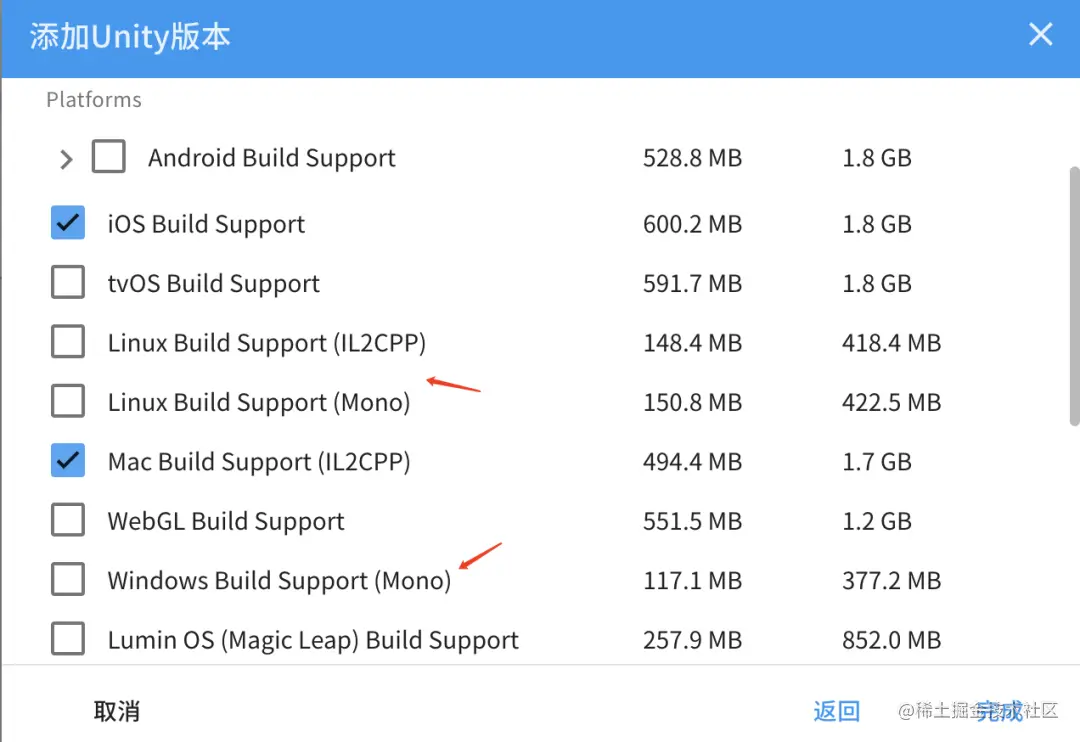 配置Target Platform为想要构建的平台。这里下拉框的可选项,如Windows/macOs/Linux,需要在安装Unity的时候勾选目标平台:
