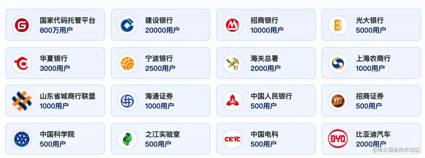 Gitee已与中国人民银行、光大银行、徽商银行、百胜中国、上海农商行、之江实验室、一汽集团等多家知名机构与企业展开深入合作,不断在金融、军工、政府、高校等多领域不断深耕细作、纵深发展。