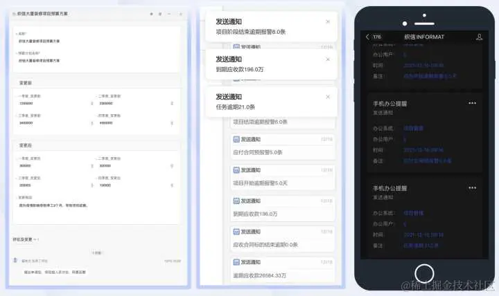 实现沟通信息管理,基于业务的审批传递结果把项目现场及公司集团总部职能部门统一到一个平台协同工作,同时实现工作结果主要资料的整理和查阅,减少物理浪费和时间浪费,提高工作效率和效果。