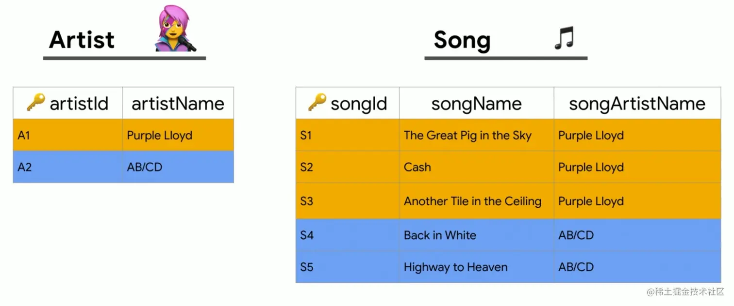 假设我们使用与之前相同的数据库和表,现在表名分别为 Artist 和 Song。如果我们希望获得音乐人到歌曲的映射集合,就要在 artistName 和 songName 之间建立关系。如下图中 Purple Lloyd 与其热门歌曲《Another Tile in the Ceiling》和《The Great Pig in the Sky》匹配,AB/CD 将与其热门歌曲《Back in White》和《Highway to Heaven》匹配。