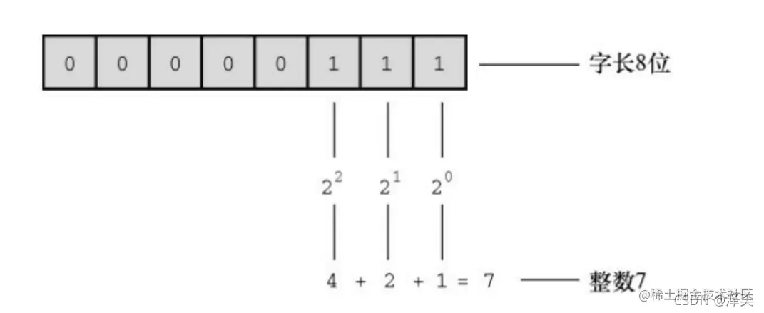 例如:−21和245都是整数。而3.14、0.22和2.1000都不是整数。计算机以二进制数字储存整数,例如,整数7以二进制写是111。因此,要在8位字节中储存 该数字,需要把前5位都设置成0,后3位设置成1,如下图所示: