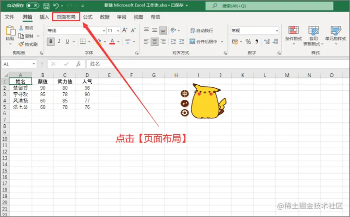 步骤1.打开一个excel表格后,可以看到最上方的功能设置菜单,有许多的功能,我们需要点击【页面布局】即可;