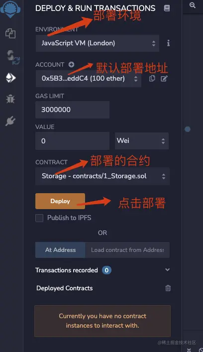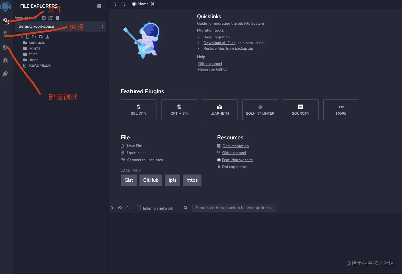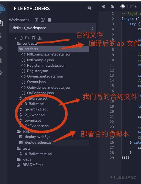 如图所示重要的三个地方,第一个是可以看到我们存放的文件,编写智能合约的地方。