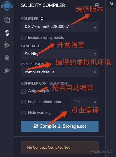值得注意的是,我们可以选择对应的版本来编译我们的合约,因为目前有些合约开发的版本还是比较低的,如果我们想调试就得选择对应的版本来编译。