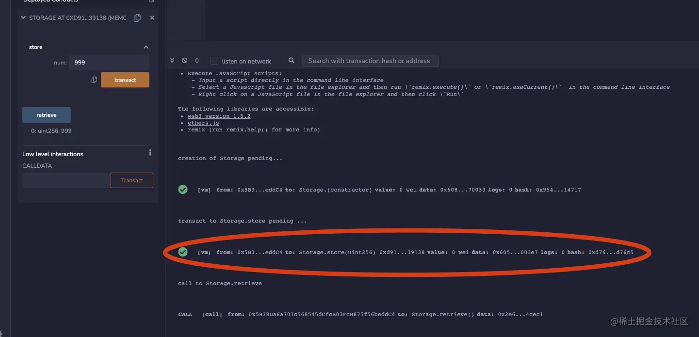 这里我们点击了transact按钮,便执行了下面的store方法,把number的值设置为了999。