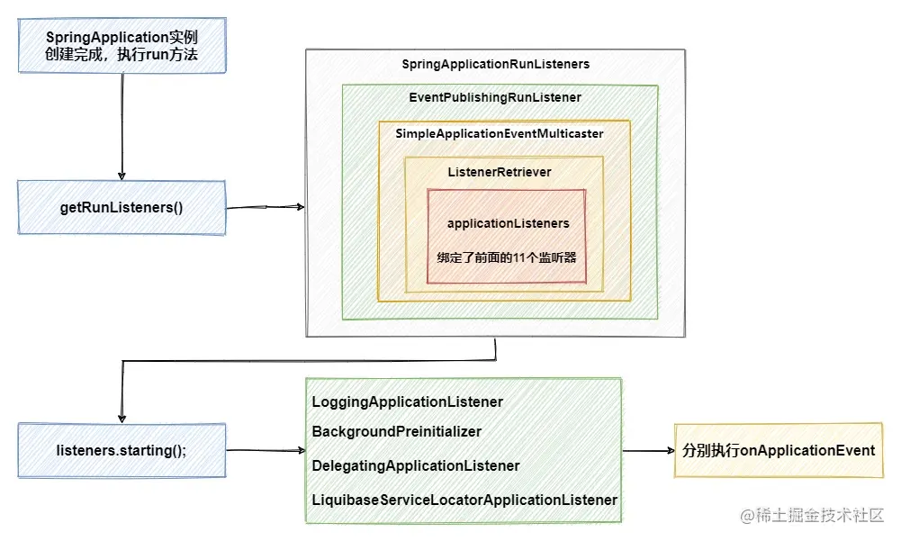 可以看到,这里通过getRunListeners方法获取的SpringApplicationRunListeners中,EventPublishingRunListener绑定了我们前面加载的11个监听器。但是在执行starting方法时,根据类型进行了过滤,最终实际只执行了4个监听器的onApplicationEvent方法,并没有我们希望看到的ConfigFileApplicationListener,让我们接着往下看。