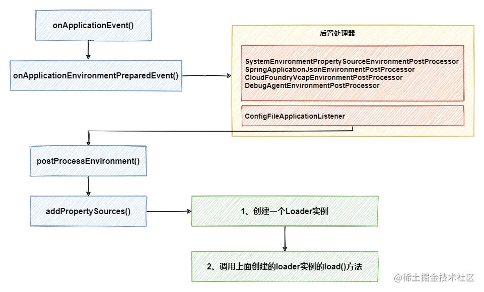 在方法的调用过程中,会加载系统自己的4个后置处理器以及ConfigFileApplicationListener自身,一共5个后置处理器,并执行他们的postProcessEnvironment方法,其他4个对我们不重要可以略过,最终比较关键的步骤是创建Loader实例并调用它的load方法。