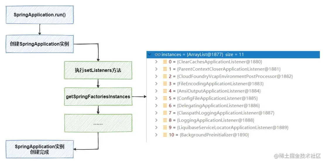 当我们启动一个SpringBoot程序,在执行SpringApplication.run()的时候,首先在初始化SpringApplication的过程中,加载了11个实现了ApplicationListener接口的拦截器。