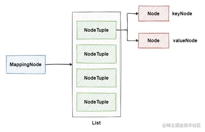 在解析yml的过程中实际使用了Composer构建器来生成节点,在它的getNode方法中,通过解析器事件来创建节点。通常来说,它会将yml中的一组数据封装成一个MappingNode节点,它的内部实际上是一个NodeTuple组成的List,NodeTuple和Map的结构类似,由一对对应的keyNode和valueNode构成,结构如下: