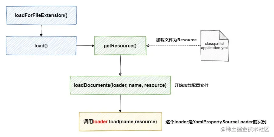 在load方法中,会通过嵌套循环方式遍历默认配置文件存放路径,再加上默认的配置文件名称、以及不同配置文件加载器对应解析的后缀名,最终找到我们的yml配置文件。接下来,开始执行loadForFileExtension方法。