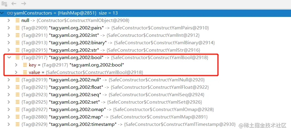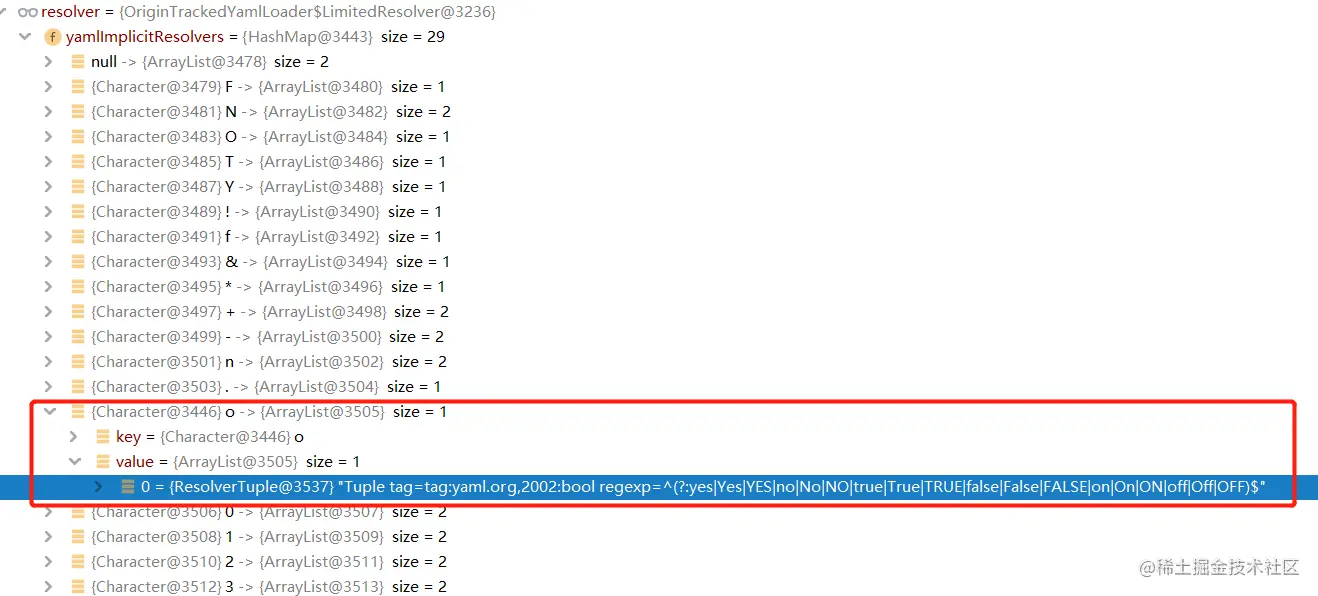 当解析到属性on时,取出首字母o对应的ResolverTuple,其中的tag就是tag:yaml.org.2002:bool。当然了,这里也不是简单的取出就完事了,后续还会对属性进行正则表达式的匹配,看与regexp中的值是否能对的上,检查无误时才会返回这个tag。