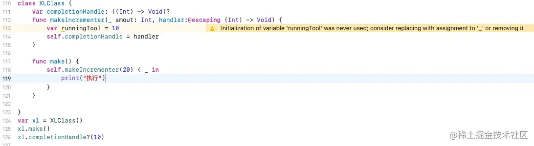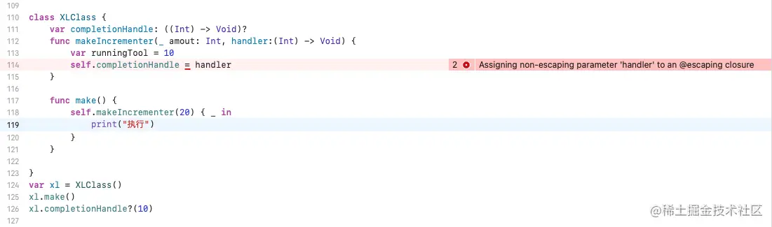 此时编译器就会提示我们,这是一个逃逸闭包,需要加上@escaping关键字描述