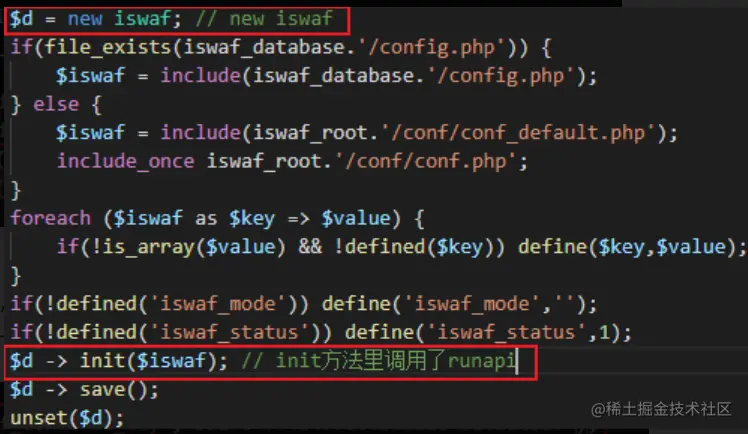 那么下一步要看一下怎么调用这个runapi方法。runapi方法属于iswaf类,而在iswaf类内有一行代码直接调用了这个方法,iswaf文件在最后会new一个对象且调用到那个方法: