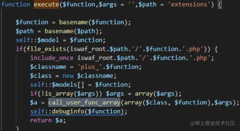 functionexecute($function,$args = '',$path = 'extensions') {$function = basename($function);$path= basename($path);self::$model = $function;if(file_exists(iswaf_root.$path.'/'.$function.'.php')) {include_once iswaf_root.$path.'/'.$function.'.php';$classname = 'plus_'.$function;$class = new $classname;self::$models[] = $function;if(!is_array($args)) $args = array($args);$a = call_user_func_array(array($class, $function),$args);self::debuginfo($function);return $a;}}