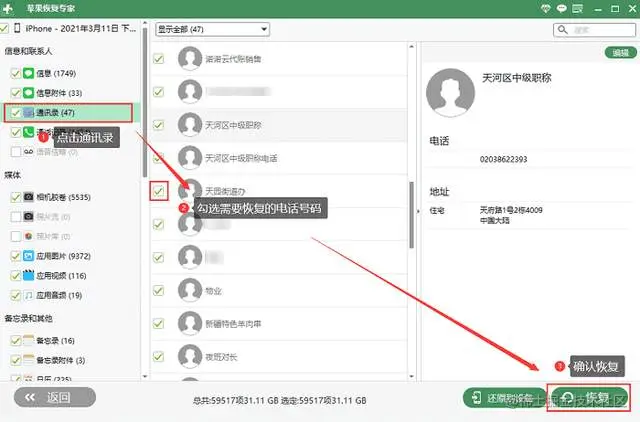第二步:扫描完成之后,在左边可以看到各种数据,直接找到“通讯录”,中间可以勾选好需要恢复的电话号码,点击右下的“恢复”等待结束就好了。