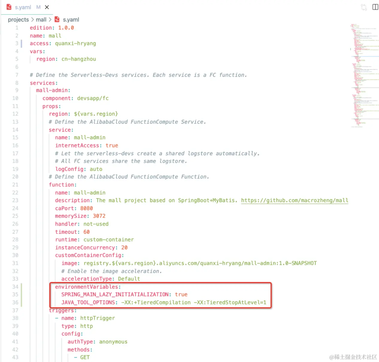 如下图所示,对 mall-admin 函数配置环境变量。然后执行 sudo -E s mall-admin deploy 部署。