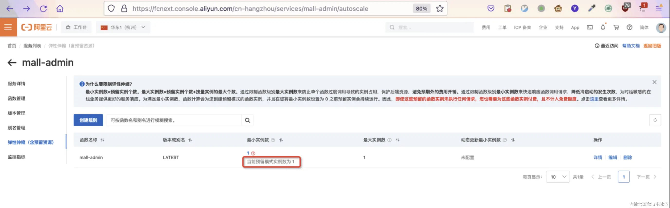 在函数计算控制台,我们可以在“弹性伸缩”页面为函数设置预留实例。
