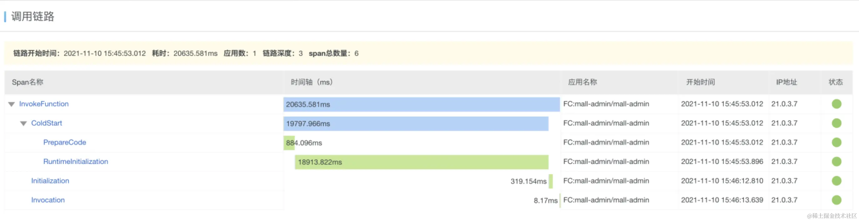 调用链路会显示冷启动各个环节的耗时。冷启动包含以下几个环节: