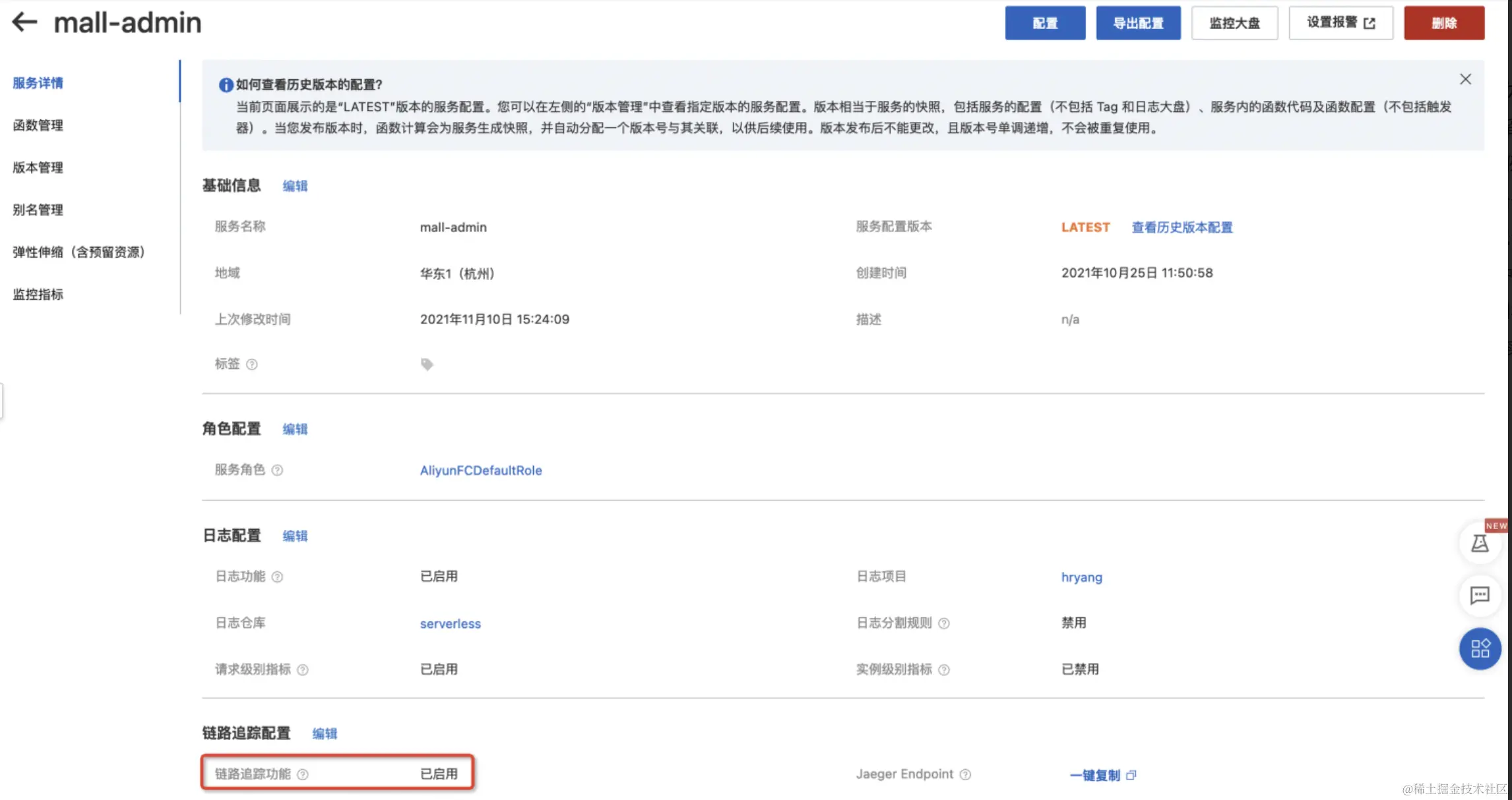 在优化冷启动之前,我们先要分析清楚冷启动各个阶段的耗时。首先在函数计算(FC) 控制台的服务配置界面,开启链路追踪功能。