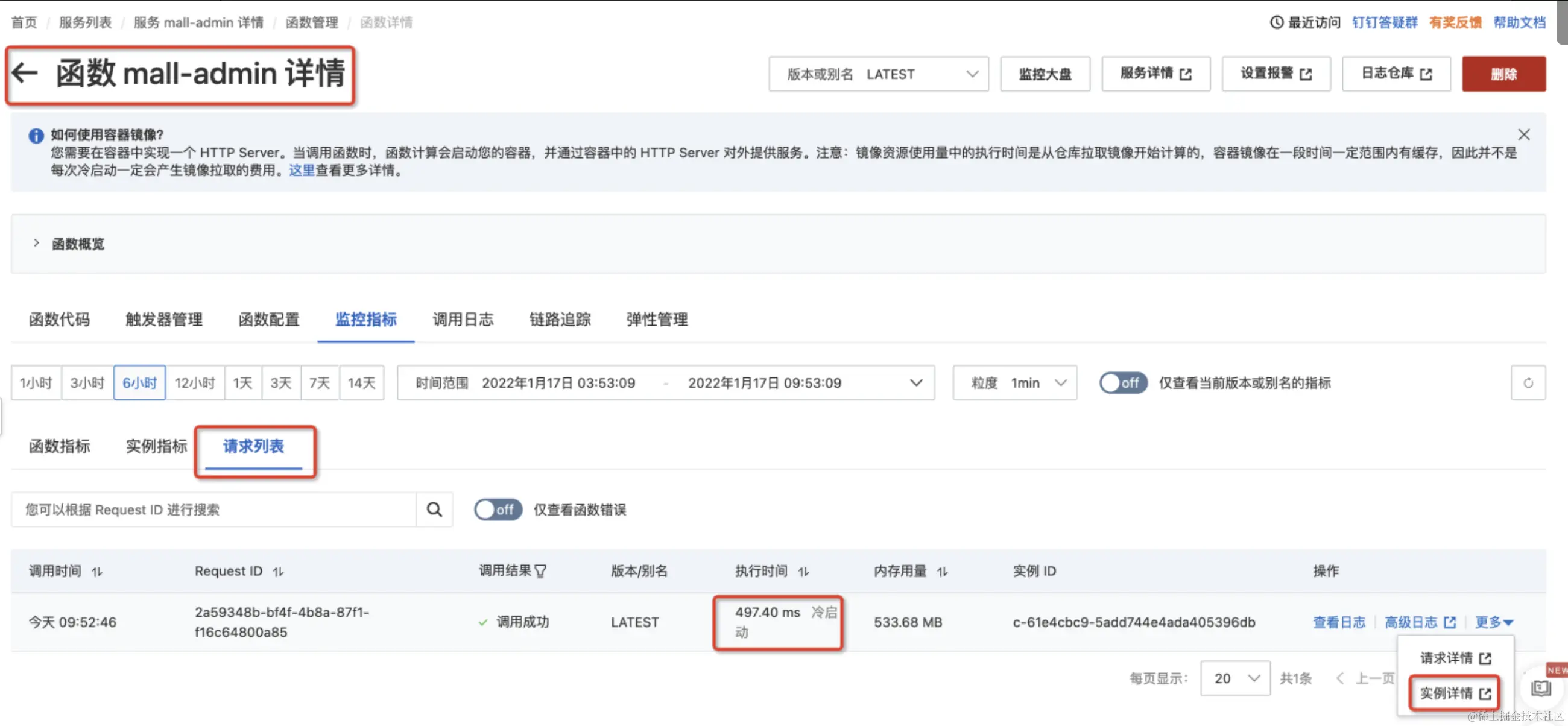 在控制台函数详情页的请求列表中找到对应的请求,点击更多中的“实例详情链接”。