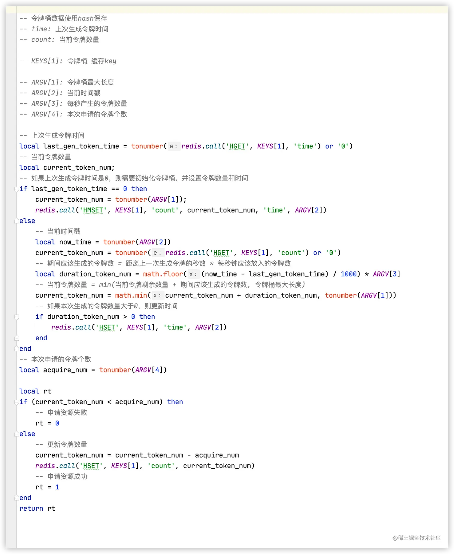 redis+lua 实现令牌桶 喵喵帕斯 2022-01-19 1,185 阅读1分钟 KEYS表示redis中的key,要传递到lua脚本中执行,可能一个脚本中会操作多个key,所以是数组表示 ARGV表示业务参数值,也可能每次操作多个业务值,所以是数组 Lua代码: Java代码: