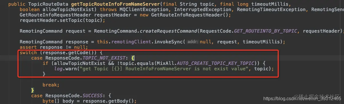 也就是回应码ResponseCode.TOPIC_NOT_EXIST,然后抛出异常 throw new MQClientException(response.getCode(), response.getRemark());被捕获之后退出返回false。