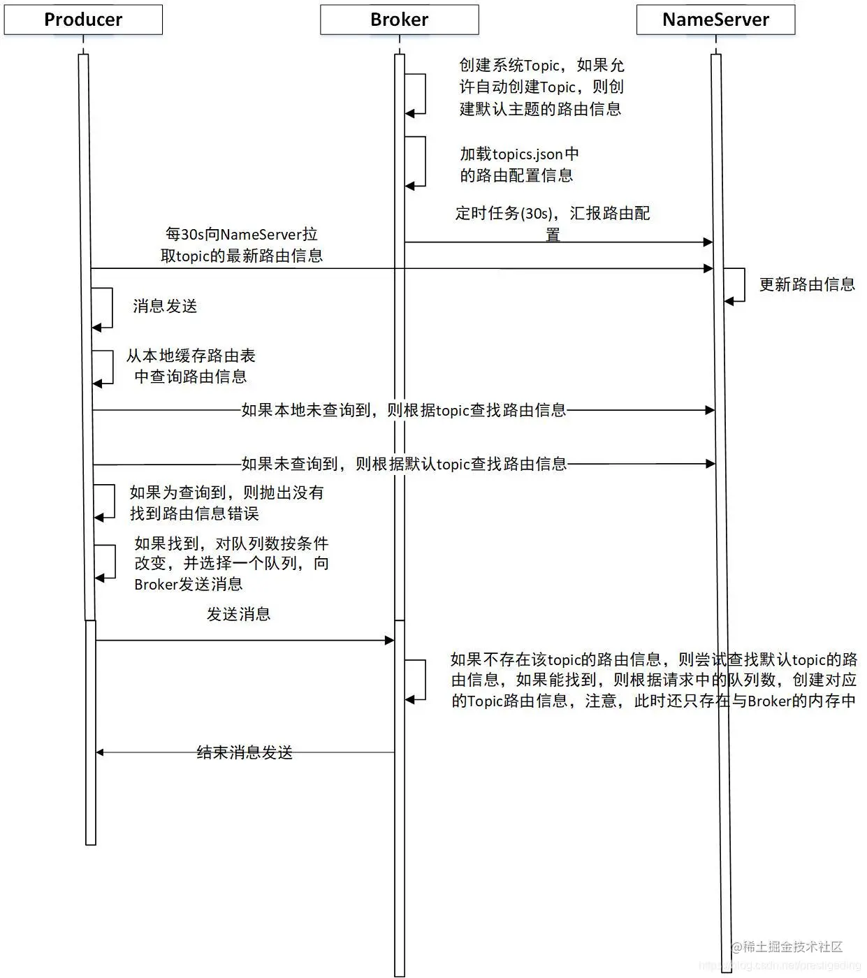 消息生产者每隔30s会从Nameserver重新拉取Topic的路由信息并更新本地路由表;在消息发送之前,如果本地路由表中不存在对应主题的路由消息时,会主动向Nameserver拉取该主题的消息。