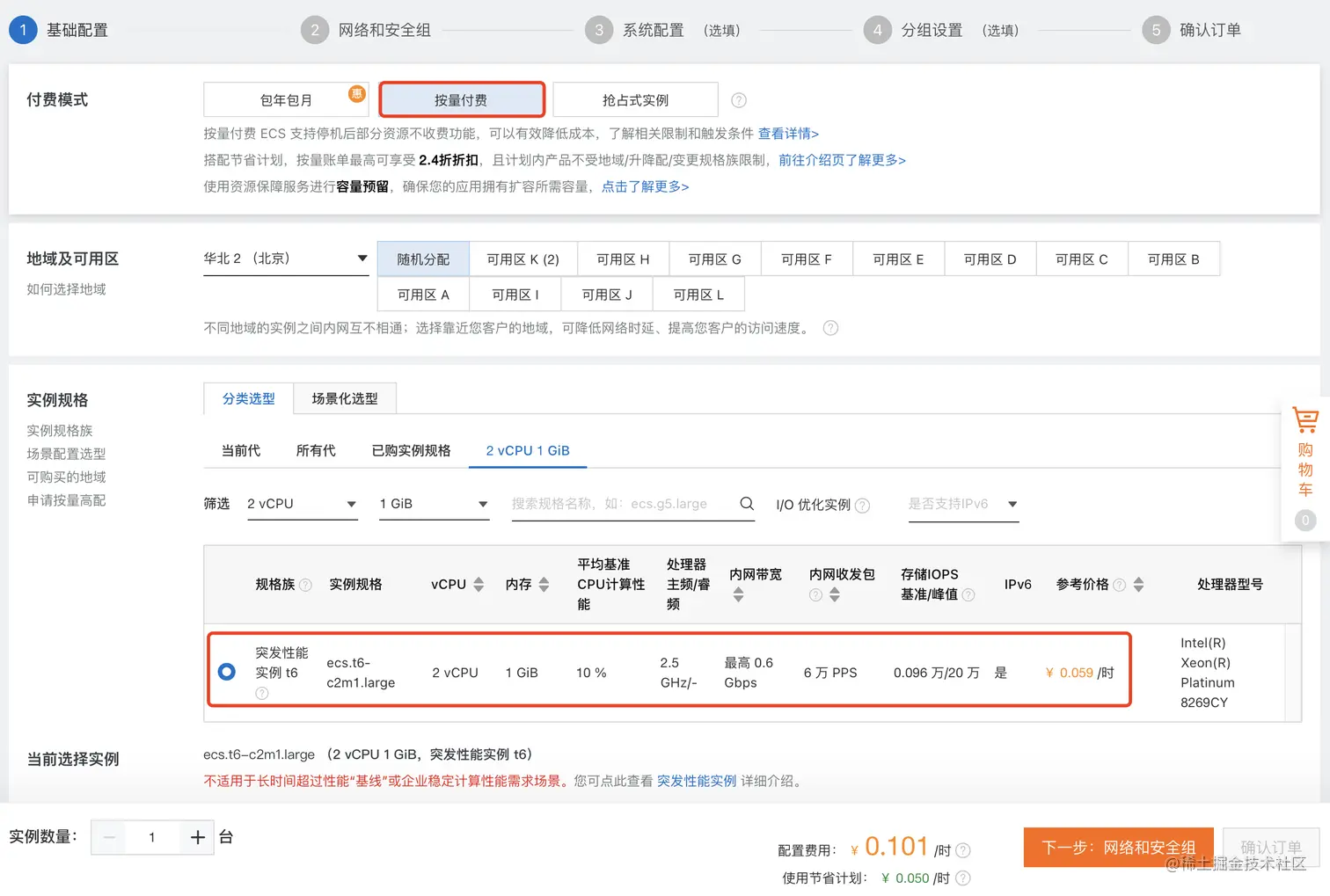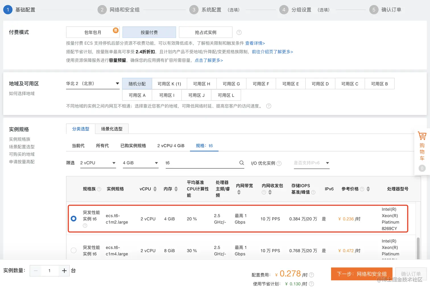 选择付费模式:按量付费,共享型;筛选 2c4g 且价位合适的镜像;