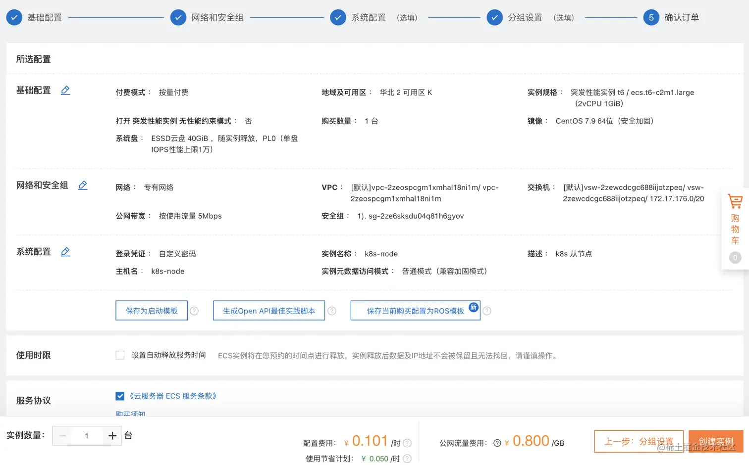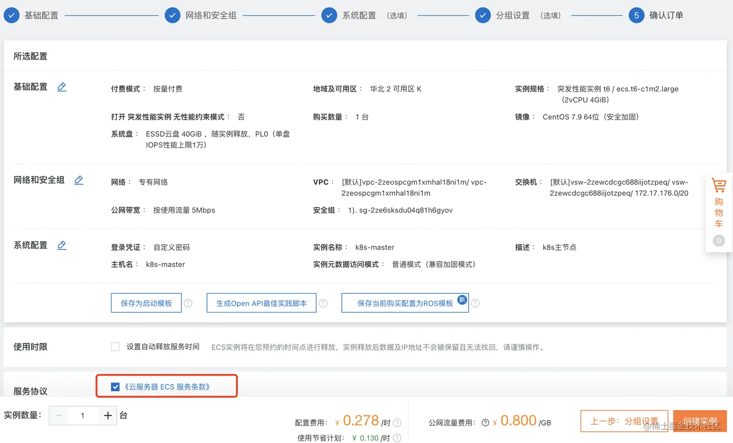 默认,无需配置,勾选服务协议,创建实例;