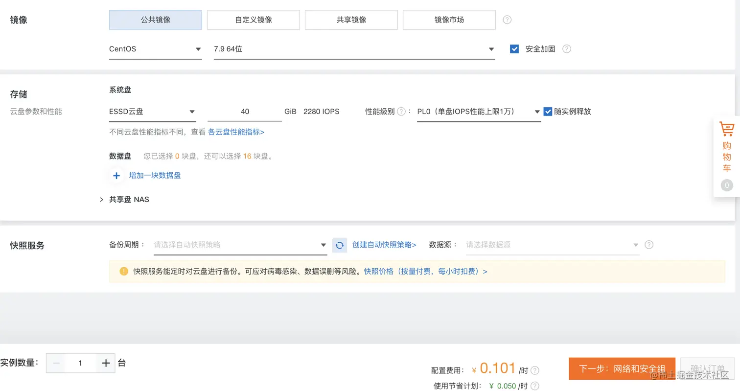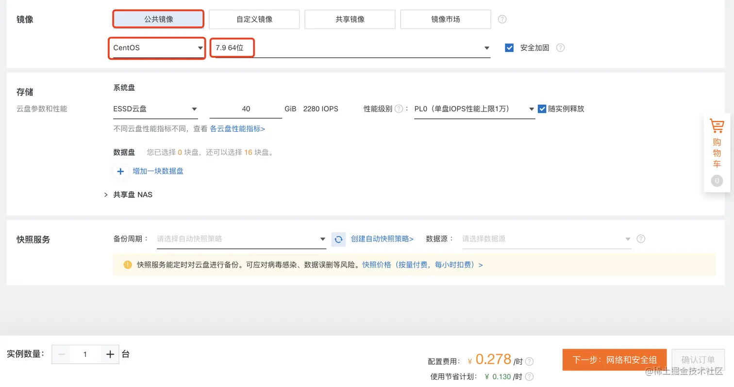 选择镜像:公共镜像,CentOS 7.9 版本 64 位