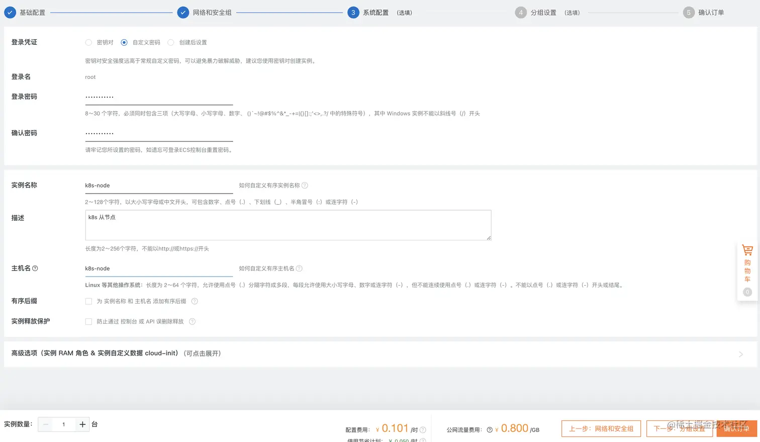 下一步,系统配置:登录凭证选择自定义密码:
