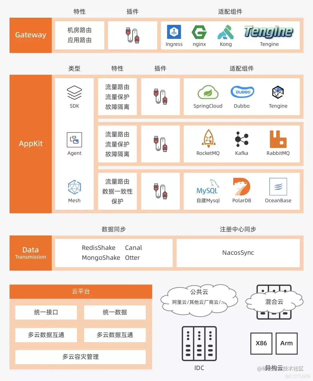 AppActive 属于应用多活的一种定义和实现,它有数据平面和管控平面的整体实现。数据平面分为 4 部分,均支持在不变更原有企业使用技术组件基础上,以插件的形式增加能力: