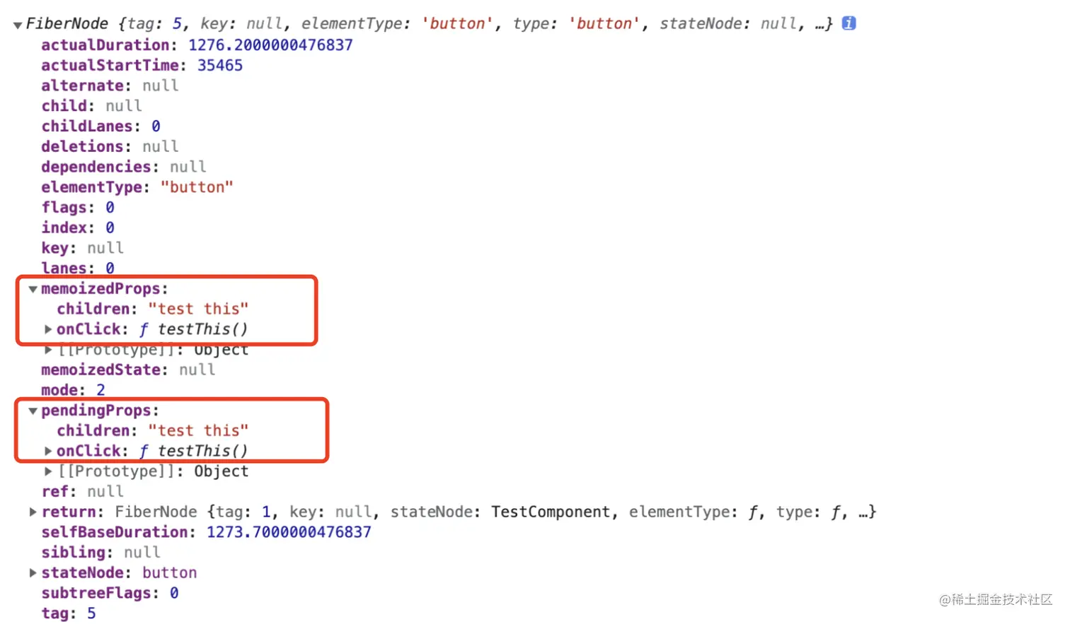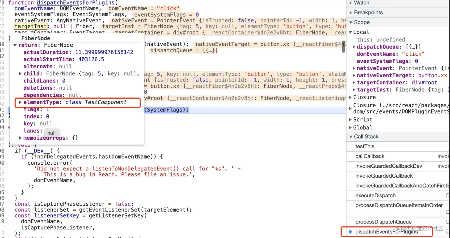 上面我们知道我们声明的事件函数testThis在fiber上,接着我们来分析下点击按钮时React是如何冒泡执行testThis函数的。