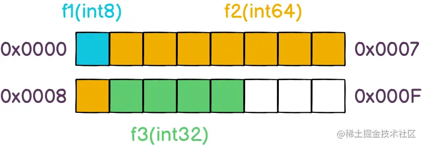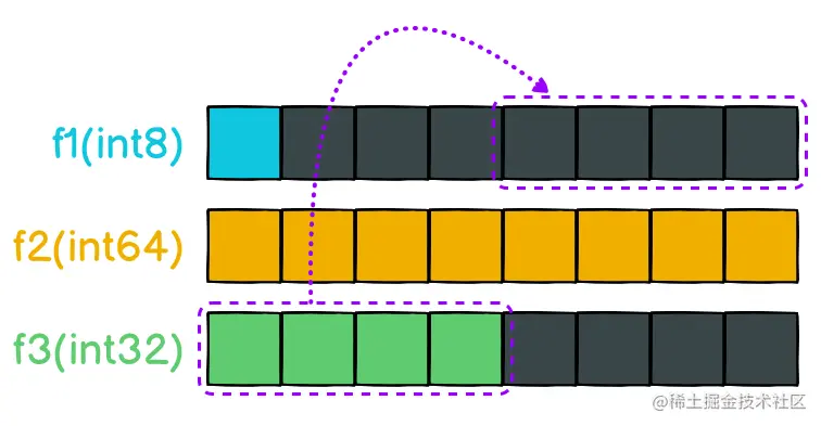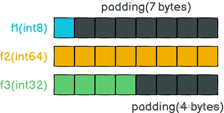 在Go程序中,Go会按照结构体中字段的顺序在内存中进行布局,所以需要将字段f2和f3的位置交换,定义的顺序变成int8、int32、int64,这样Go编译器才会顺利的按上图那样排列。